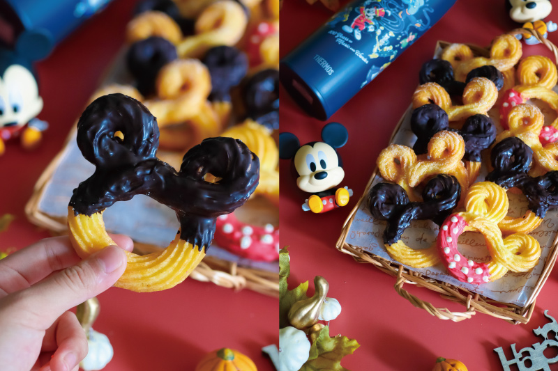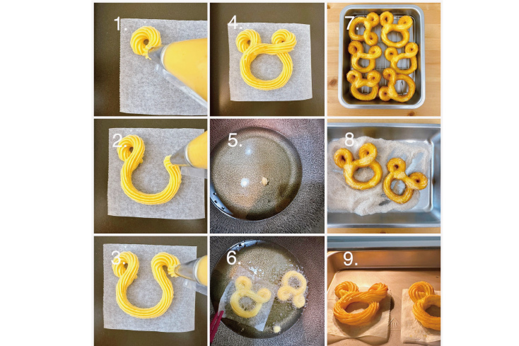 1. 剪10*10大小的烘焙紙,麵糊從左上角順時鐘擠一圈小圓 2. 繼續往下擠一圈大圓 3. 到右上角再順時針擠一圈小圓 4. 繼續往左邊耳朵拉接起來,一圈完成米奇吉拿棒造型,不做造型直接擠長條形就可以 5. 熱油鍋,筷子放下去旁邊起泡,或者擠一點剩下的麵糊,起泡代表鍋熱 6. 米奇吉拿棒連同烘焙紙一起下鍋炸,吉拿棒定型,底下烘焙紙會脫落,夾出烘焙紙繼續炸到兩面金黃 7. 夾出米奇吉拿棒瀝油 8. 趁熱裹上肉桂糖 👉 不喜歡肉桂可以只裹上細砂糖,也可以沾巧克力變成巧克力吉拿棒 9. 如果不想油炸,氣炸或者烤箱也可以,氣炸180度8-10分鐘,翻面5分鐘、烤箱預熱200度,約20分鐘再悶5分鐘完成,每家氣炸烤箱跟烤箱的烤溫不同,可以自己斟酌加減烘烤的時間喔!