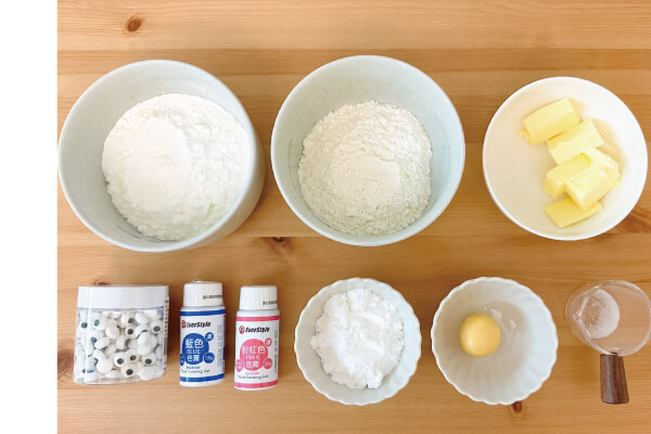 1. 材料:無鹽奶油50克、糖粉18克、低筋麵粉50克、玉米粉45克、鹽巴0.5克、熟蛋黃1顆、食用色素少許