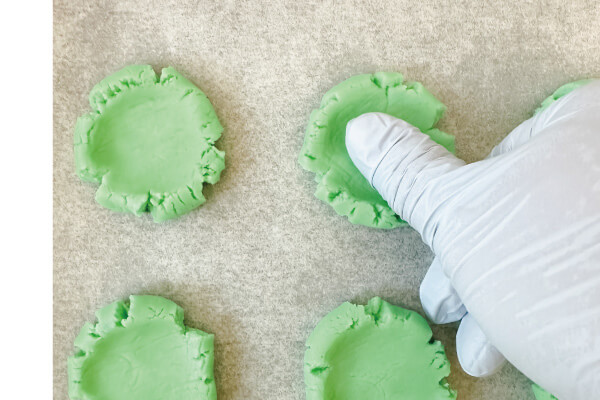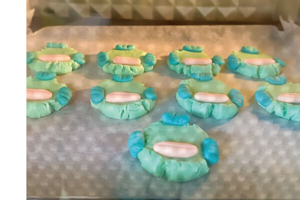 9.淺藍色10克搓成圓型,放在烤盤上用大拇指按壓,餅乾旁會裂開是正常的喔!
