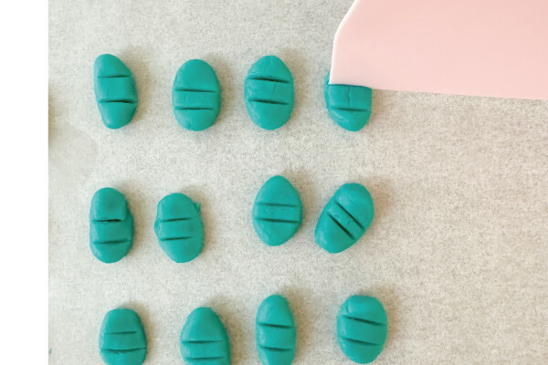 10. 深藍色麵糰0.7-1克搓成小橢圓形,用刀背或是刮板切出條紋當魚鰭。