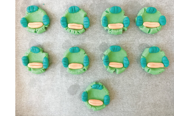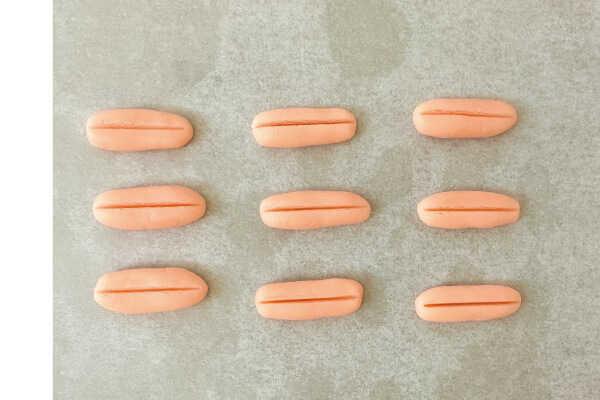 11. 淺粉色麵糰0.7-1克搓成長條型,刮板中間輕輕切一刀當嘴巴(可以不切,最後用巧克力畫嘴巴也可以)。
